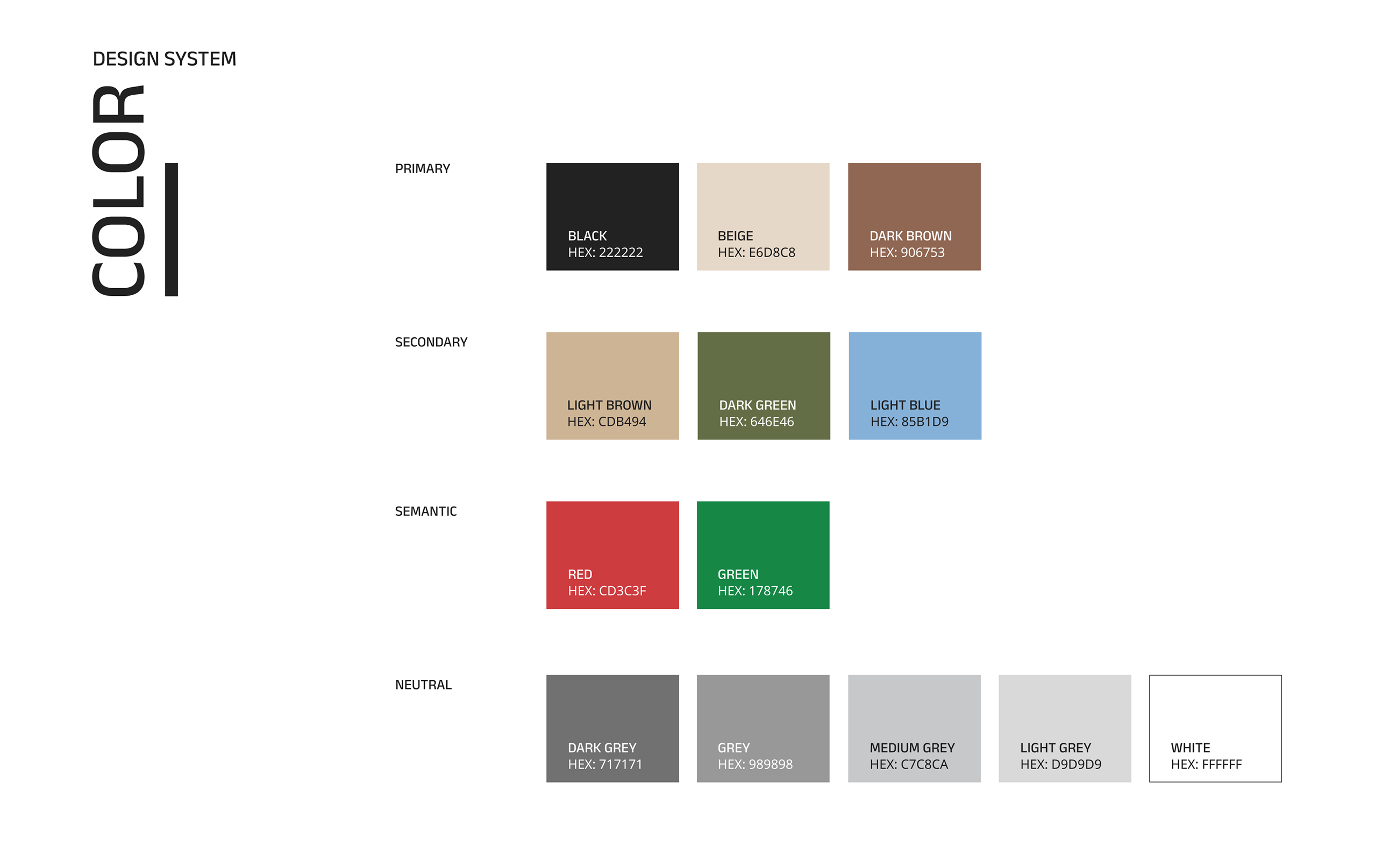 Color elements and values were created. Resulting in three primary colors, three secondary, two semantic and five neutrals.