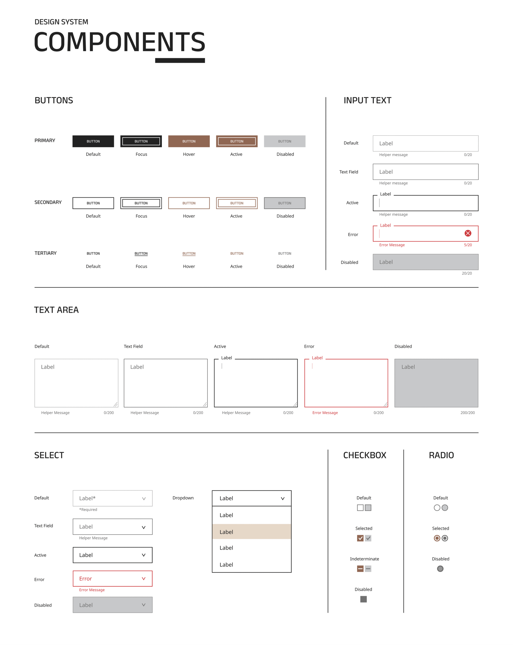 Main components were designed to be able to complete the UI design process. The components included in the product are: buttons, input text, text area, select, checkbox and radio. All of them include their different states.