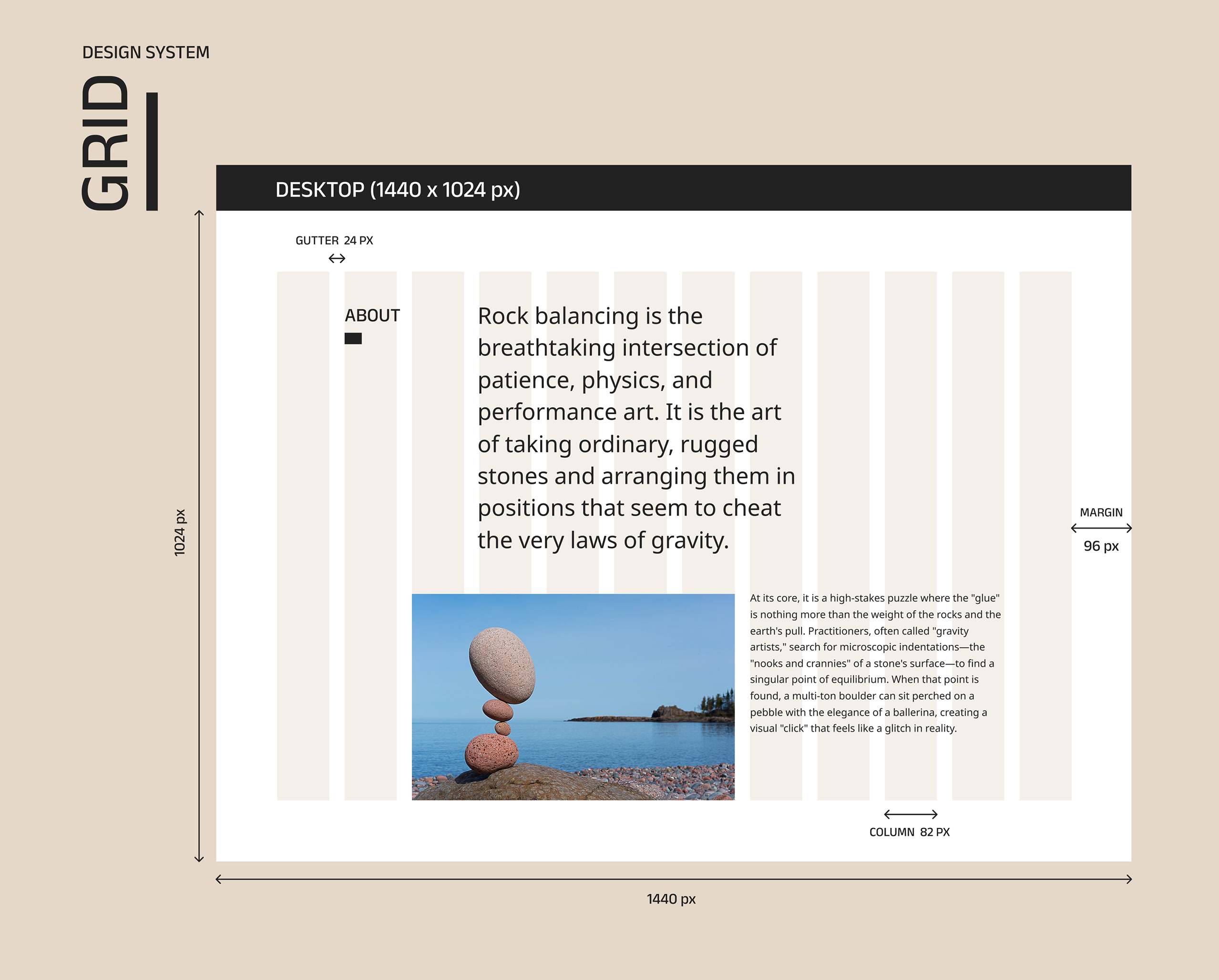 The grid created for the desktop version of the digital product (web site) has the following specs: Dimensions: 1440x1024px; margin: 96px; gutter: 24px; column: 82px.